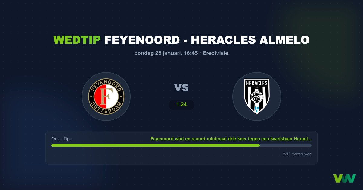 Feyenoord ontvangt Heracles Almelo in De Kuip voor wat op papier een routineuze overwinning moet worden. Met een quotering van 1.24 voor de thuisploeg is er weinig twijfel over de verwachte winnaar. De focus voor de ploeg uit Rotterdam ligt op het behouden van de aansluiting met de top en het verbeteren van het doelsaldo. Trainer Arne Slot zal hameren op een snelle openingstreffer om de wedstrijd vroeg in het slot te gooien.