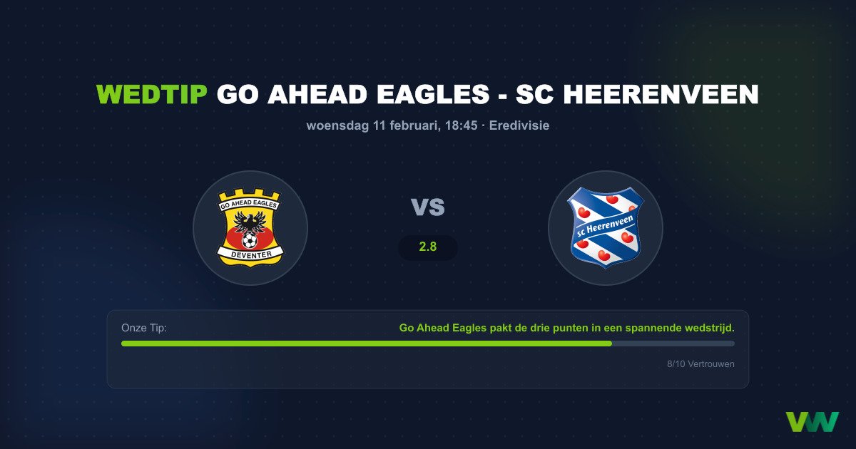 De Eredivisie brengt ons een typische 'middenmootkraker' in Deventer, waar Go Ahead Eagles sc Heerenveen ontvangt. De Adelaarshorst staat bekend als een fort waar de Eagles zelden makkelijk te kloppen zijn. Hun speelstijl, gekenmerkt door hoge druk en fysieke intensiteit, is vaak lastig voor bezoekende ploegen. De thuisvorm van GAE is doorslaggevend; zij halen het overgrote deel van hun punten in eigen huis en zullen deze wedstrijd zien als cruciaal in de strijd om de play-offs.