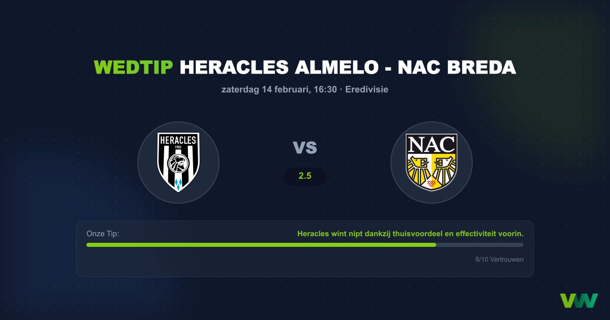 De clash tussen Heracles Almelo en NAC Breda op 14 februari belooft een typische Eredivisie-middenmootstrijd te worden. De odd van 2.5 voor een thuiszege van Heracles geeft aan dat de bookmakers een redelijk evenwichtige, maar licht in het voordeel van de thuisploeg, wedstrijd verwachten. Heracles staat bekend om hun vechtlust in het Erve Asito en zal gebrand zijn op drie punten om afstand te nemen van de gevarenzone.