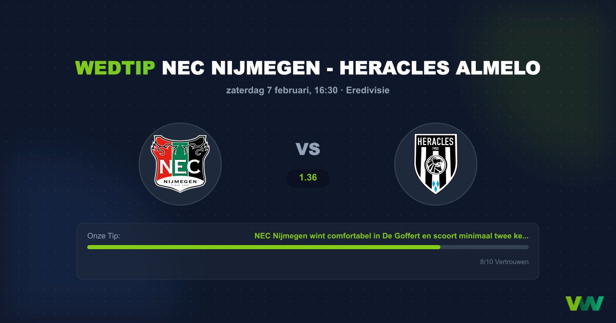 Heracles Almelo daarentegen heeft het traditioneel moeilijk in uitwedstrijden. Hun defensieve organisatie is vaak kwetsbaar, en ze missen de aanvallende flair om een ploeg als NEC structureel pijn te doen. De Almelose ploeg zal waarschijnlijk proberen om compact te spelen en te loeren op de counter, maar de recente resultaten wijzen erop dat dit zelden succesvol is tegen teams uit het linkerrijtje. Het is aannemelijk dat NEC vroeg in de wedstrijd de leiding neemt, wat het spelbeeld volledig in hun voordeel zal kantelen.