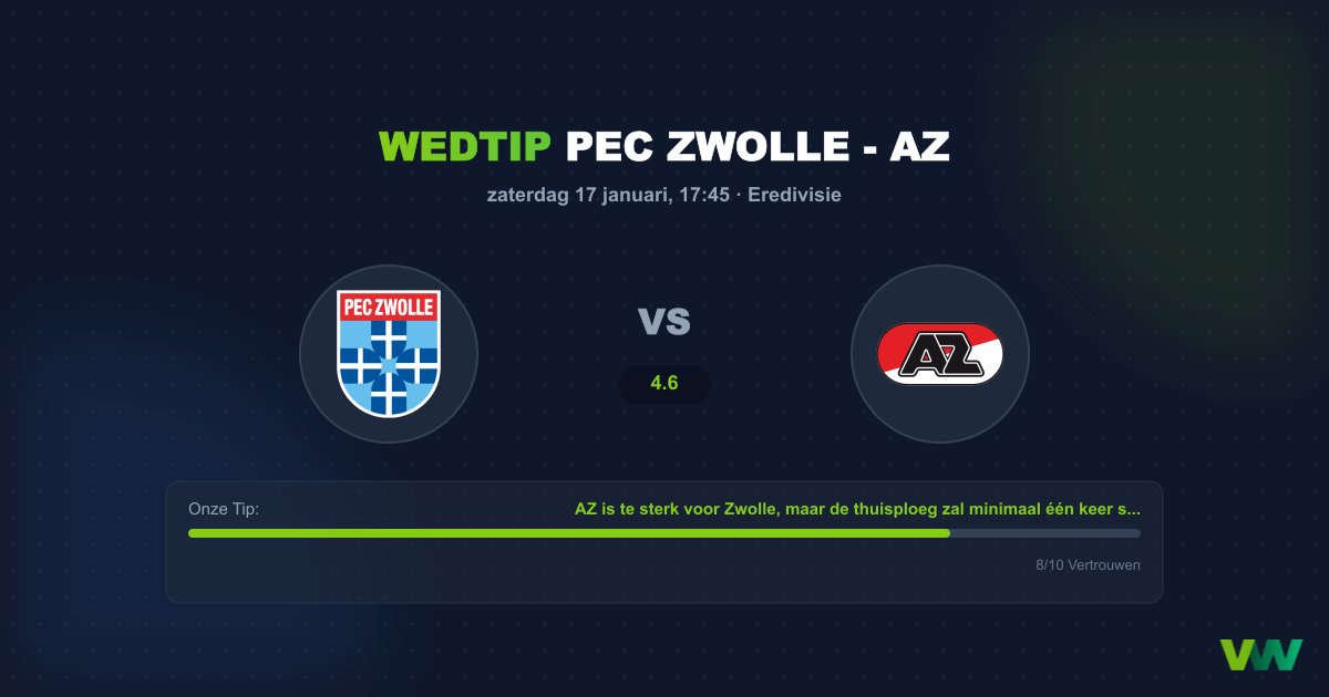 De Eredivisie hervat met een interessante confrontatie in Zwolle, waar PEC de sterke formatie van AZ ontvangt. AZ reist af als de duidelijke favoriet, wat wordt onderstreept door de hoge notering van 4.6 voor een overwinning van de thuisploeg. AZ strijdt doorgaans mee om de Europese tickets en heeft de individuele kwaliteit en de diepte in de selectie om PEC, dat zich meestal in de middenmoot of daaronder bevindt, te domineren. De focus van AZ zal liggen op het snel controleren van het middenveld en het benutten van de ruimtes achter de Zwolse verdediging.