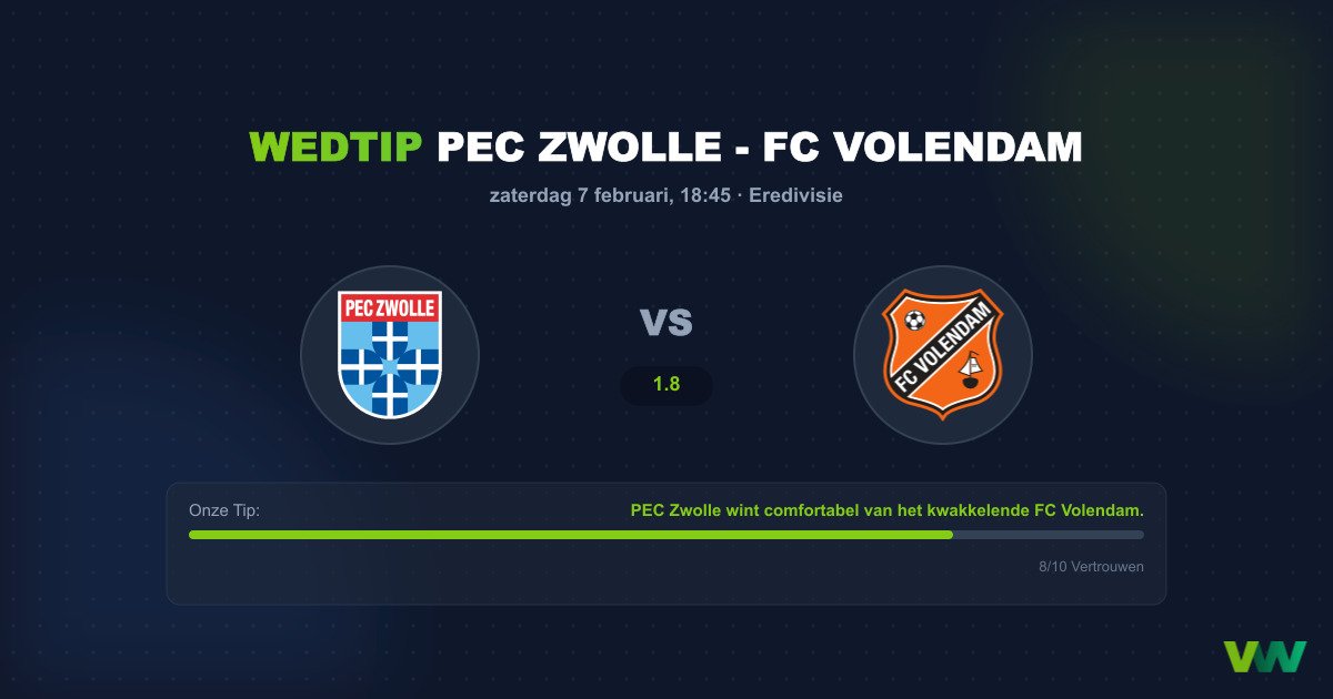 PEC Zwolle ontvangt FC Volendam in een wedstrijd die cruciaal is voor beide ploegen, zij het met verschillende doelen. PEC Zwolle, de duidelijke favoriet met een quotering van 1.80, staat onder druk om thuis de volle buit te pakken tegen een ploeg die waarschijnlijk vecht tegen degradatie. Hoewel PEC zelf geen topseizoen draait, zijn dit de wedstrijden waarin de basis voor handhaving gelegd moet worden. De sfeer in het MAC³PARK Stadion moet de ploeg vleugels geven tegen een Volendam dat buitenshuis structureel kwetsbaar is.