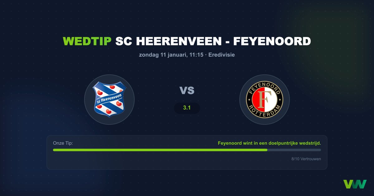 Onze analyse leidt tot de conclusie dat Feyenoord de hogere individuele kwaliteit en bredere selectie heeft om de winst over de streep te trekken. Echter, de noodzaak om te winnen gecombineerd met de aanvallende speelstijl van Heerenveen zorgt ervoor dat de defensieve discipline soms ontbreekt bij beide teams. Daarom verwachten we een 1-3 of 2-3 uitslag. Het is verstandig om te kijken naar combinatieweddenschappen die de overwinning van Feyenoord koppelen aan de hoge doelpuntproductie.